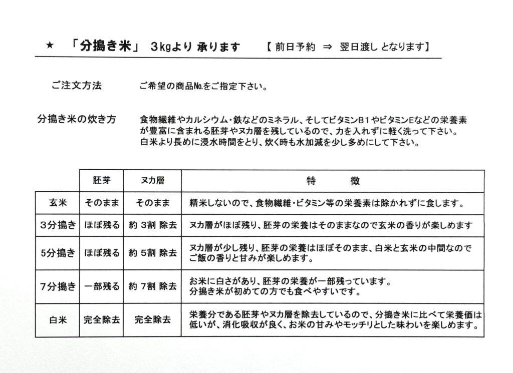 分搗き米は、胚芽やヌカ部分を一部残した精米方式で、精米度合いにより「3分搗き・5分搗き・7分搗き」などがあり、数字が大きい順に白米に近くなり独特の風味を出します。